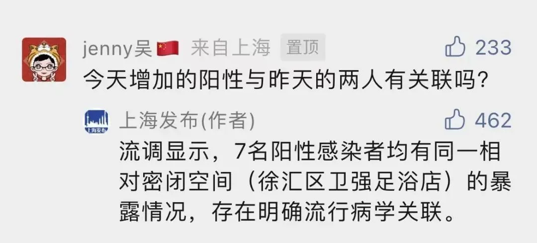 上海发布回应:流调显示,7名阳性感染者均有同一相对密闭空间(徐汇区卫强足浴店)的暴露情况,存在明确流行病学关联。