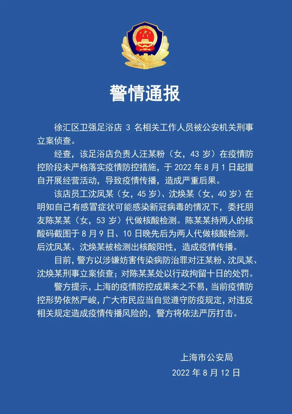 另据警民直通车上海微信号消息,上海市公安局今天(12日)发布警情通报,徐汇区卫强足浴店3名相关工作人员被公安机关刑事立案侦查。