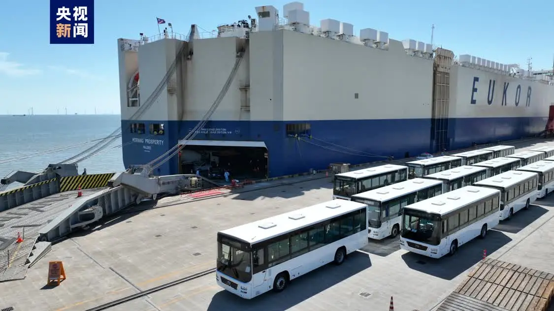 9月10日19时,上海南港码头,马绍尔群岛籍“黎明昌盛”轮在办完出境边检手续后,装载着250辆国产大巴及其他国产小汽车的10余个品牌,总计1922辆国产汽车,驶向尼加拉瓜科林托港口。多品牌和多类型车型装船使该轮仿佛成为国产汽车展厅,其中宇通大巴更是首次批量从上海南港码头出口。