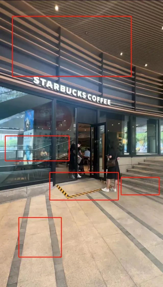 网传图片中比较具有辨识度的店面设计、门口台阶、地砖、窗口反射的电梯画面等,都能与星巴克(览海国际广场店)的环境图一一对应。